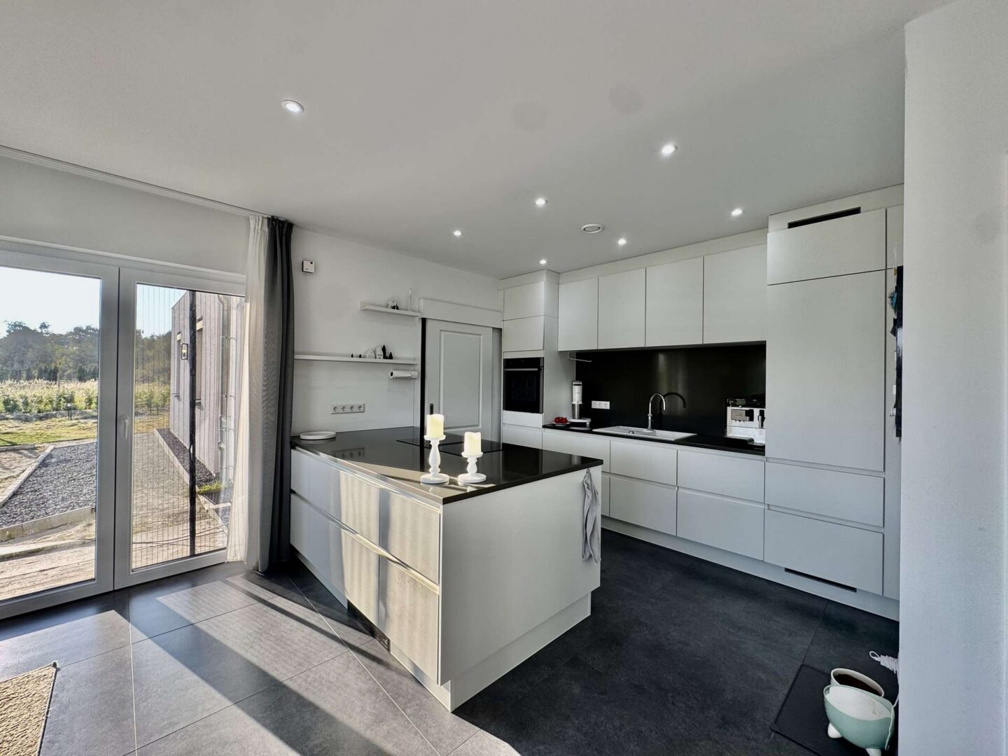 Geradeaus von der Diele aus gelangen Sie in den großzügigen Wohn- und Essbereich mit offener Küche. Dieser beeindruckende Raum misst etwa 56 Quadratmeter und erstreckt sich über die gesamte Gartenseite. Die großen Panoramafenster eröffnen einen traumhaften Blick in den liebevoll und aufwendig gestalteten Garten. Eine weitläufige Terrasse, die sich über die gesamte Gartenseite erstreckt, lädt zu stimmungsvollen Sommerabenden im Freien ein.