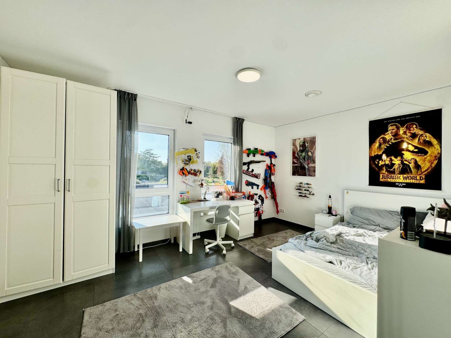 Durch die Hauseingangstür betreten Sie die einladende Diele. Links befindet sich ein Raum, der derzeit als Büro genutzt wird. Rechts führt ein Flur zur Garage. Auf der rechten Seite des Flurs liegen ein weiterer Raum sowie der Hauswirtschaftsraum. Links befinden sich ein Abstellraum und das Gäste-WC, das über eine zusätzliche Tür direkten Zugang zum Garten bietet. Die Installation von Waschbecken, WC und Dusche im Gäste-WC steht noch aus.