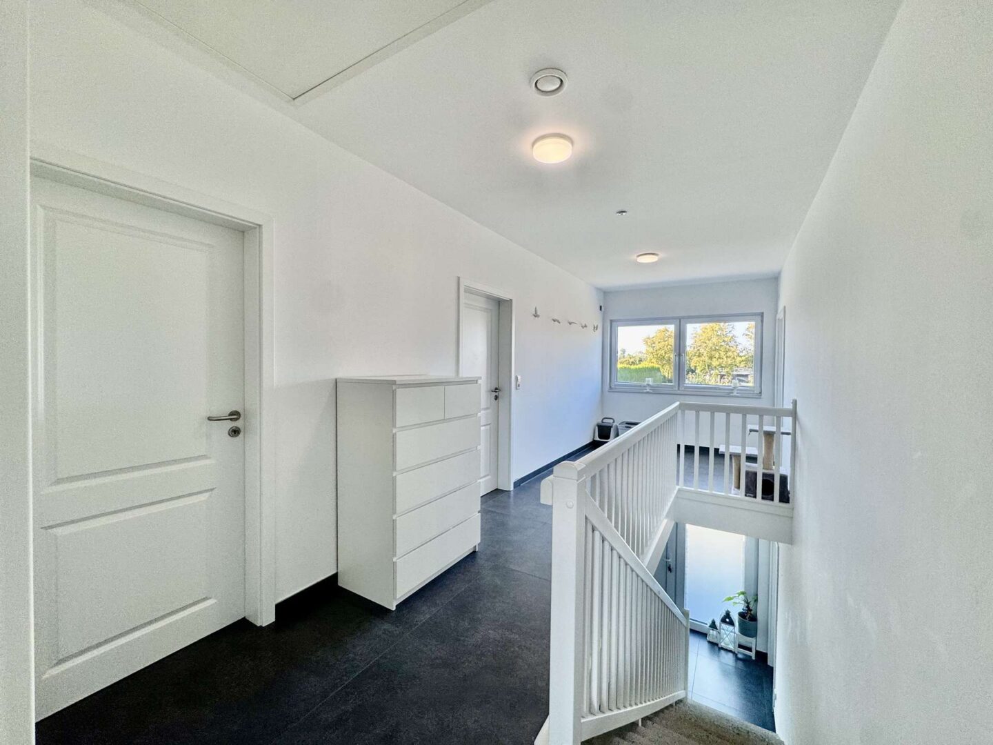 Im Obergeschoss befinden sich vier etwa gleich große Schlafzimmer, ein Abstellraum sowie das Badezimmer, das mit einer Badewanne und einer ebenerdigen Dusche ausgestattet ist.